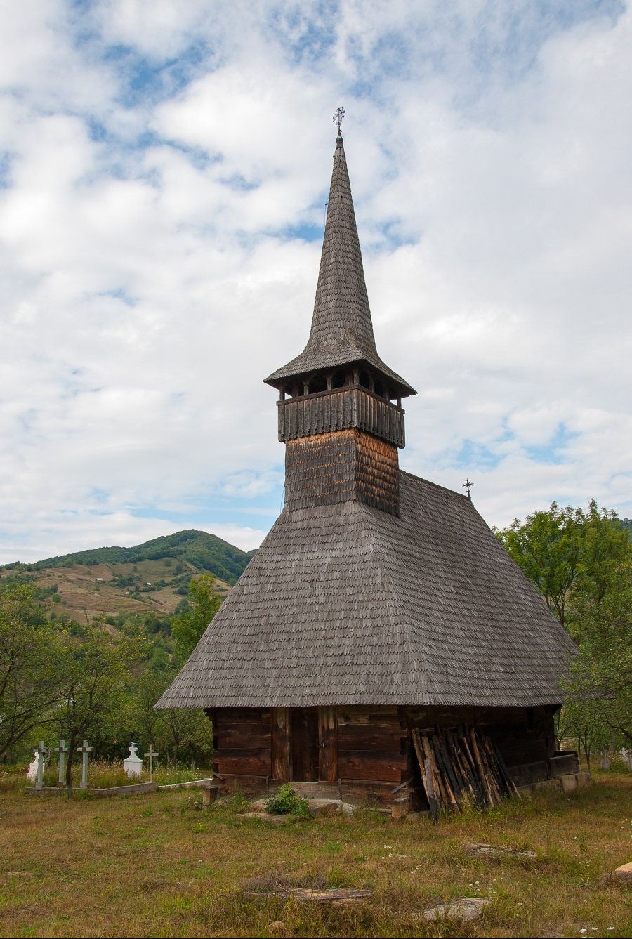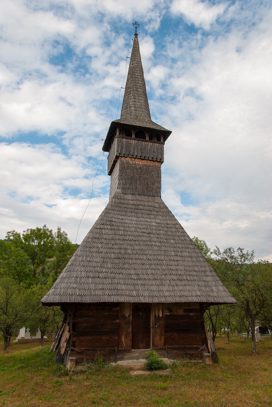 "Biserica de lemn cu hramul "Sf. Arhanghel Mihail" a fost ridicată pe la 1560 sau chiar 1507, întrucât greu se poate descifra inscripţia slavonă de pe ancadramentul uşii şi de pe peretele nordic. Construcţia de plan dreptunghiular, având absida pătrată cu pereţii laterali retraşi spre interior, a fost ridicată din numai cinci grinzi masive din lemn de frasin, ultimele două prelungindu-se în console ornamentale la capete sub forma unor discuri distribuite ritmic. Acoperişul, înalt şi unitar, învelit cu şiţă în formă de fagure, inclusiv partea inferioară a turnului şi a coifului pătrat, ce se prelungeşte octogonal se termină cu o cruce din fier forjat.